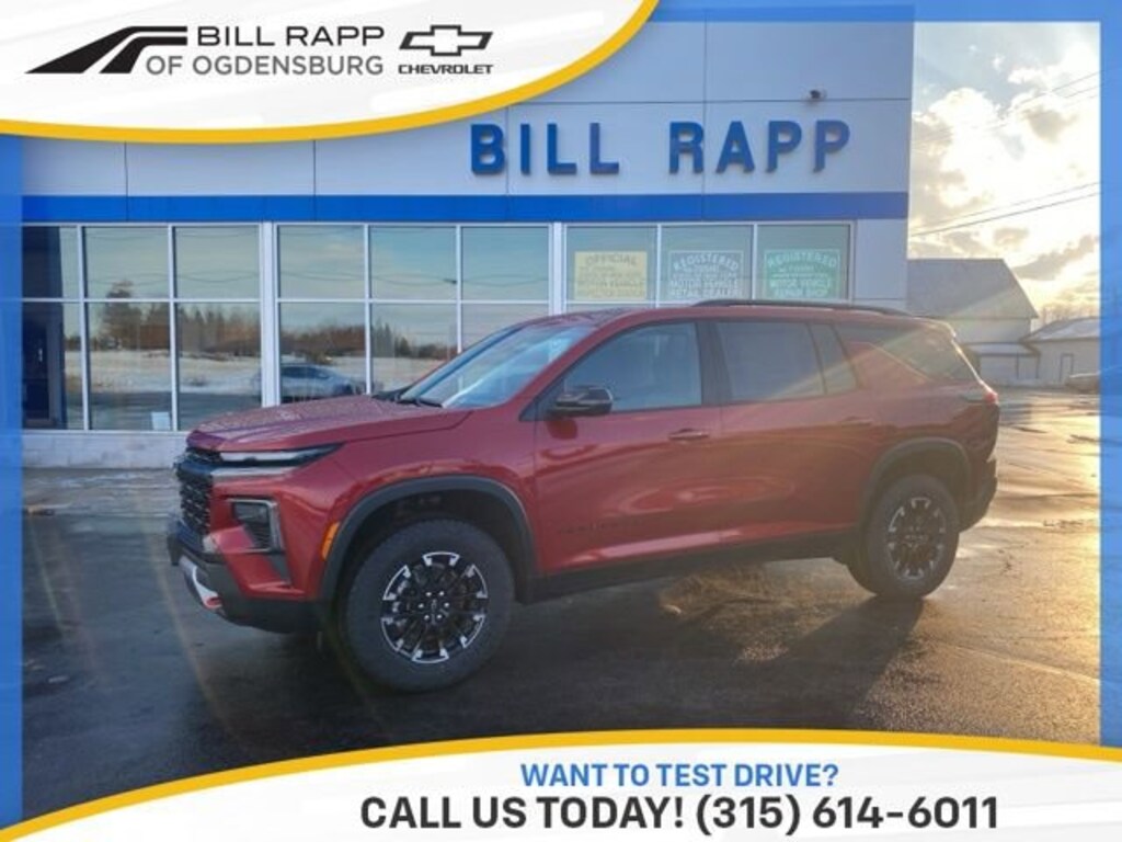 Radiant Red Tintcoat 2026 Chevrolet Traverse Z71 AWD 8-Speed Automatic 2.5L DOHC AWD, 1st and 2nd Row All-Weather Floor Liners, 3 Years SiriusXM, 3rd Row All-Weather Floor Liner, 3rd row seats: split-bench, 4-Way Manual Front Passenger Seat Adjuster, 4-Wheel Disc Brakes, 6 Speakers, 6-Speaker Audio System Feature, 8-Way Power Driver Seat Adjuster, ABS brakes, Air Conditioning, Alloy wheels, AM/FM radio: SiriusXM with 360L, Apple CarPlay/Android Auto, Auto High-beam Headlights, Automatic temperature control, Brake assist, Child-Seat-Sensing Airbag, Compass, Delay-off headlights, Deleted Mobile Service Plus, Driver Confidence Package, Driver door bin, Driver vanity mirror, Dual front impact airbags, Dual front side impact airbags, Electronic Stability Control, Emergency communication system: OnStar, Evotex Seat Trim, Floor Liner Package, Four wheel independent suspension, Front anti-roll bar, Front Bucket Seats, Front Center Armrest, Front dual zone A/C, Front reading lights, Fully automatic headlights, HD Surround Vision, Heated door mirrors, Heated Driver and Front Passenger Seats, Heated front seats, Heated steering wheel, Illuminated entry, Integrated Cargo Liner, Key Card, Low tire pressure warning, Navigation System, Occupant sensing airbag, Outside temperature display, Overhead airbag, Overhead console, Panic alarm, Passenger door bin, Passenger vanity mirror, Power door mirrors, Power driver seat, Power Dual Glass Panoramic Sliding Sunroof, Power Liftgate, Power Outlet, Power steering, Power windows, Preferred Equipment Group 2Z7, Radio data system, Radio: : Audio System w/17.7 Diagonal Display, Rear air conditioning, Rear anti-roll bar, Rear Camera Mirror, Rear Pedestrian Alert, Rear reading lights, Rear window defroster, Rear window wiper, Remote keyless entry, Security system, SiriusXM with 360L Trial Subscription, Speed control, Speed-sensing steering, Spoiler, Steering wheel mounted audio controls, Tachometer, Telescoping steering wheel, Tilt steering wheel, Traction control, Traffic Sign Recognition, Trip computer, Turn signal indicator mirrors, Variably intermittent wipers, Voltmeter, Wheels: : 18 High Gloss Black Painted Aluminum, Z71 Black Nameplate Kit (LPO), AWD.