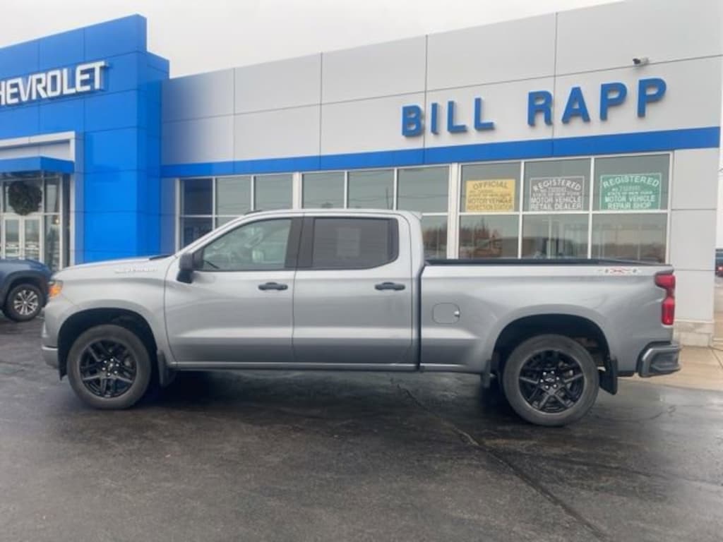 Clean CARFAX. Sterling Gray Metallic 2024 Chevrolet Silverado 1500 Custom 4WD 8-Speed Automatic 2.7L I4 Turbocharged DOHC 16V LEV3-SULEV30 310hp 8-Speed Automatic, 4WD, Jet Black w/Cloth Seat Trim, 10-Way Power Driver Seat w/Lumbar, 120-Volt Bed Mounted Power Outlet, 120-Volt Interior Power Outlet, 3.42 Rear Axle Ratio, 3.5 Monochromatic Display Driver Info Center, 4-Wheel Disc Brakes, 40/20/40 Front Split-Bench Seat, 6 Speakers, 6-Speaker Audio System, 6 Rectangular Black Tubular Assist Steps (LPO), ABS brakes, Air Conditioning, AM/FM radio: SiriusXM, Auto High-beam Headlights, Auto-Locking Rear Differential, Automatic Emergency Braking, Bluetooth® For Phone, Brake assist, Bumpers: body-color, Chevrolet Connected Access Capable, Chevytec Spray-On Black Bedliner, Cloth Seat Trim, Color-Keyed Carpeting Floor Covering, Compass, Custom Convenience Package, Custom Value Package, Deep-Tinted Glass, Delay-off headlights, Driver door bin, Driver vanity mirror, Dual front impact airbags, Dual front side impact airbags, Dual Rear USB Ports (Charge Only), Electric Rear-Window Defogger, Electrical Steering Column Lock, Electronic Cruise Control, Electronic Stability Control, EZ Lift Power Lock & Release Tailgate, Following Distance Indicator, Forward Collision Alert, Front anti-roll bar, Front Center Armrest w/Storage, Front Frame-Mounted Black Recovery Hooks, Front Pedestrian Braking, Front reading lights, Front Rubberized Vinyl Floor Mats, Front wheel independent suspension, Fully automatic headlights, HD Rear Vision Camera, Heated door mirrors, High Capacity Suspension Package, Hitch Guidance, Illuminated entry, Integrated Trailer Brake Controller, IntelliBeam Automatic High Beam On/Off, Lane Keep Assist w/Lane Departure Warning, LED Cargo Area Lighting, Low tire pressure warning, Manual Tilt Wheel Steering Column, Occupant sensing airbag, OnStar & Chevrolet Connected Services Capable, Outside temperature display, Overhead airbag, Overhead console, Panic alarm, Passenger door bin, Passenger vanity mirror, Power door mirrors, Power driver seat, Power Front Windows w/Driver Express Up/Down, Power Front Windows w/Passenger Express Down, Power Rear Windows w/Express Down, Power steering, Power windows, Preferred Equipment Group 1CX, Premium audio system: Chevrolet Infotainment 3, Radio data system, Radio: Chevrolet Infotainment 3 System, Rear 60/40 Folding Bench Seat (Folds Up), Rear reading lights, Rear Rubberized-Vinyl Floor Mats, Rear step bumper, Rear Wheelhouse Liners, Rear window defroster, Remote Keyless Entry, Remote keyless entry, Remote Vehicle Starter System, Security system, Single Outlet Exhaust, SiriusXM Radio, Speed control, Speed-sensing steering, Split folding rear seat, Standard Tailgate, Tachometer, Theft Deterrent System (Unauthorized Entry), Tilt steering wheel, Traction control, Trailering Package, Trip computer, Variably intermittent wipers, Voltmeter, Wheels: 20 x 9 High Gloss Black Painted Alum, Wi-Fi Hot Spot Capable, 8-Speed Automatic, 4WD, Jet Black w/Cloth Seat Trim.
